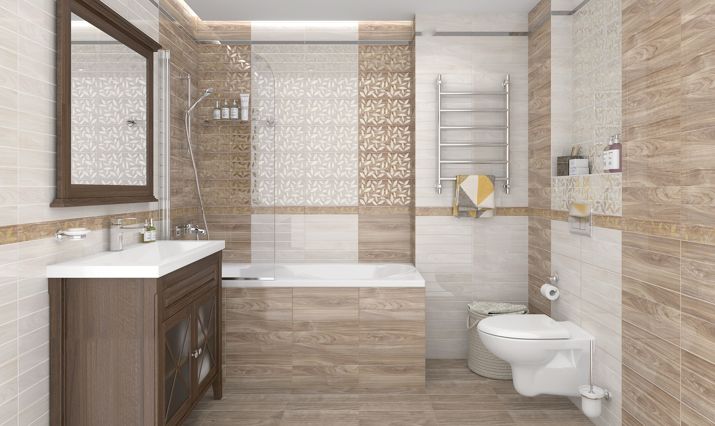 Коллекция Bona богата разнообразием тёплых и холодных оттенков. Цветовая гамма из бежевого, тёмно-бежевого, серого и тёмно-серого визуально расширяет пространство и наполняет ванную комнату мягким светом. Керамическая плитка имитирует дерево в виде сложенных вместе досок, напоминающих паркет или вагонку. Цвета максимально точно приближены к натуральным, с переливами оттенков и природными рисунками.
