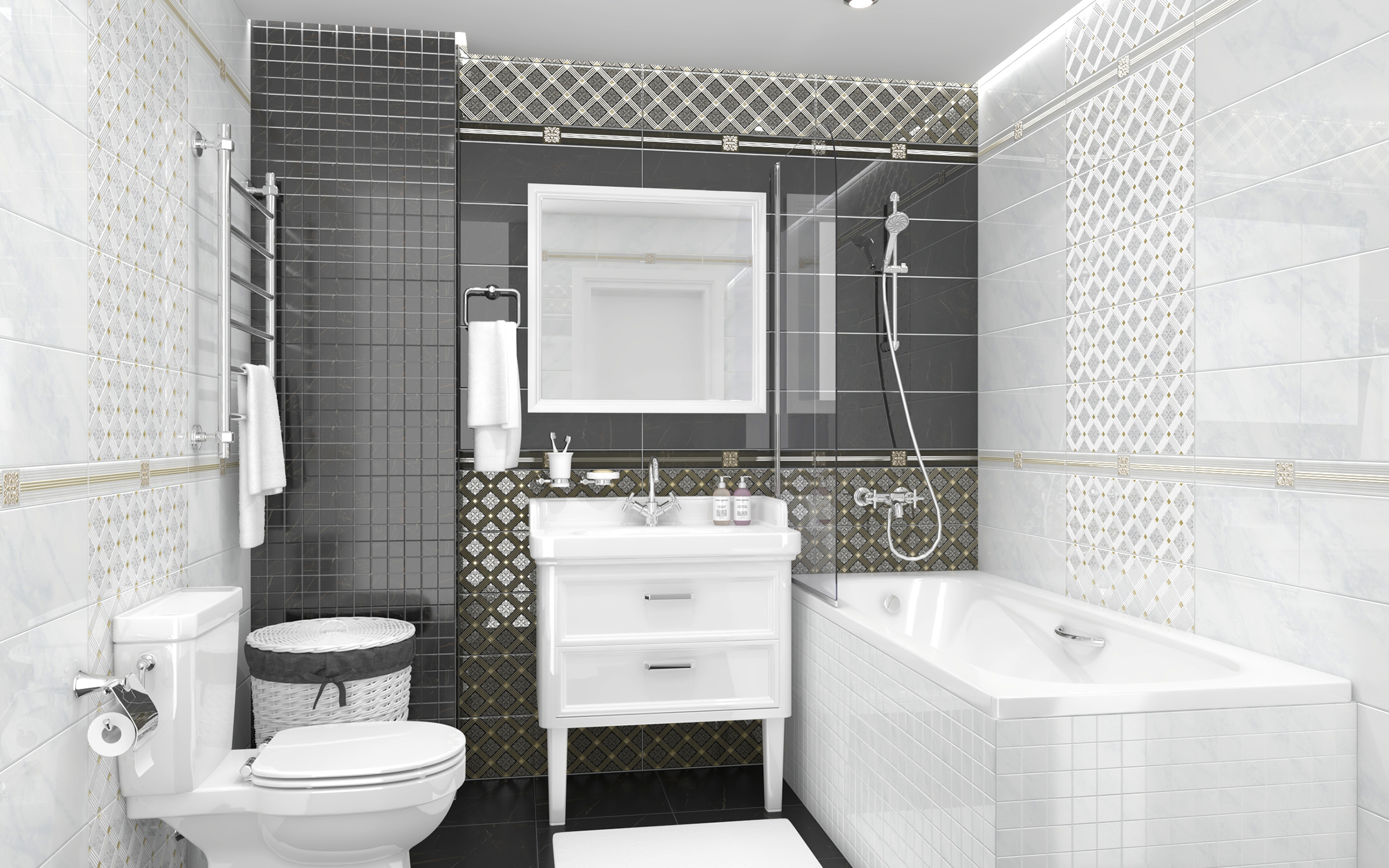Роскошная коллекция Royal перенесёт вас в Королевский дворец! Красота благородного мрамора была передана в множестве цветов – светло-кофейном, кофейном, бежевом, коричневом, чёрном и белом. В пару к каждому цвету идёт псевдомозаика. В коллекции также представлена мозаика-головоломка без контуров. Настенная плитка микс сделана в виде модуля из каменных плашек разного цвета. Декоры коллекции обладают чарующим шармом. Ромбовидный орнамент напоминает шикарные обои дворцов: он украшен растительными узорами и золотистыми контурами. Бордюры с растительным узором, покрытым золотистой тугоплавкой эмали, завершают линейку декоративных элементов.